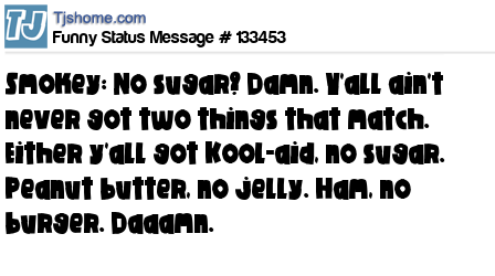 X says Smokey: No sugar? Damn. Y'all ain't never got two things that match. Either y'all got Kool-aid, no sugar. Peanut butter, no jelly. Ham, no burger. Daaamn.