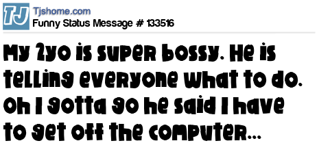 X My 2yo is super bossy. He is telling everyone what to do. Oh I gotta go he said I have to get off the computer...