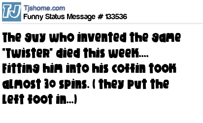 X The guy who invented the game "Twister" died this week.... Fitting him into his coffin took almost 30 spins. ( they put the left foot in...)