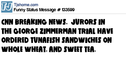 X  CNN BREAKING NEWS.  JURORS IN THE GEORGE ZIMMERMAN TRIAL HAVE ORDERED TUNAFISH SANDWICHES ON WHOLE WHEAT, AND SWEET TEA.