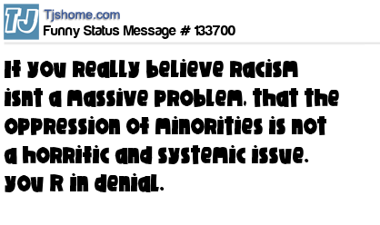 X  If you really believe racism isnt a massive problem, that the oppression of minorities is not a horrific and systemic issue. you R in denial.