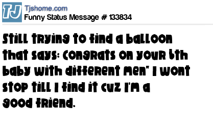 X says Still trying to find a balloon that says: Congrats on your 6th baby with different men" I wont stop till I find it cuz I'm a good friend.