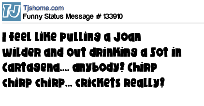 X says I feel like pulling a Joan wilder and out drinking a Sot in Cartagena.... anybody? Chirp chirp chirp... crickets really?