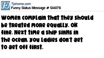 X Women complain that they should be treated more equally. OK fine. Next time a ship sinks in the ocean, you ladies don't get to get off first.