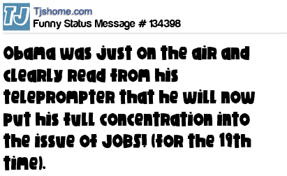 X Obama was just on the air and clearly read from his teleprompter that he will now put his full concentration into the issue of JOBS! (for the 19th time).