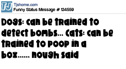 X Dogs: can be trained to detect bombs... Cats: can be trained to poop in a box...... nough said