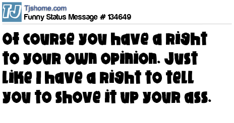 X says Of course you have a right to your own opinion. Just like I have a right to tell you to shove it up your ass.