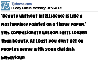X "Beauty without intelligence is like a masterpiece painted on a tissue paper." Yeh, compasionate wisdom lasts longer than beauty. At least you don't get on people's nerve with your childish behaviour.