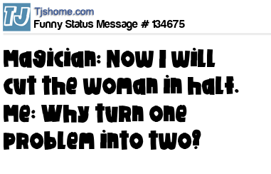 X says Magician: Now I will cut the woman in half. Me: Why turn one problem into two?