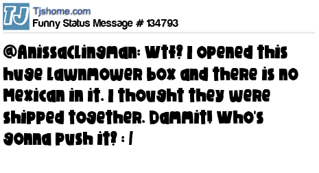 X @AnissaClingman: Wtf? I opened this huge lawnmower box and there is no Mexican in it. I thought they were shipped together. Dammit! Who's gonna push it? : /