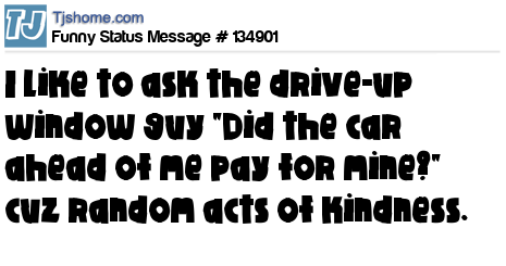 X says I like to ask the drive-up window guy "Did the car ahead of me pay for mine?" cuz random acts of kindness.