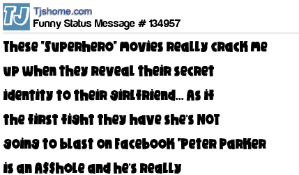 X says These "Superhero" movies really crack me up when they reveal their secret identity to their girlfriend... As if the first fight they have she's NOT going to blast on Facebook "Peter Parker is an A$$hole and he's really Spiderman"....
