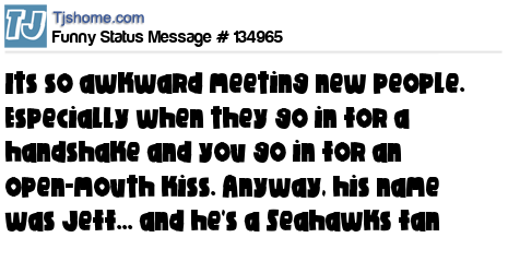 X says Its so awkward meeting new people. Especially when they go in for a handshake and you go in for an open-mouth kiss. Anyway, his name was Jeff... and he's a Seahawks fan