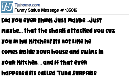 X Did you ever think just maybe...just maybe... that the shark attacked you cuz you in his kitchen? Its not like he comes inside your house and swims in your kitchen,... and if that ever happened its called "Tuna Surprise Dinner!"