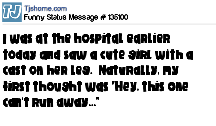 X says I was at the hospital earlier today and saw a cute girl with a cast on her leg. Naturally, my first thought was "Hey, this one can't run away..."