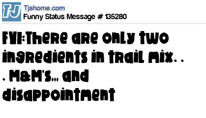 X FYI:There are only two ingredients in trail mix. . . M&M's,,, and disappointment