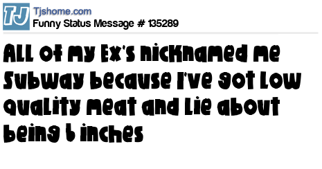 X says All of my Ex's nicknamed me Subway because I've got low quality meat and lie about being 6 inches