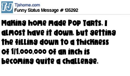 X Making home made Pop Tarts. I almost have it down, but getting the filling down to a thickness of 1/1,000,000 of an inch is becoming quite a challenge.