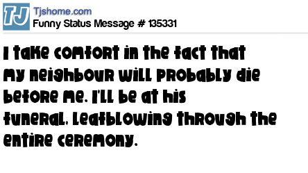 X I take comfort in the fact that my neighbour will probably die before me. I'll be at his funeral, leafblowing through the entire ceremony.