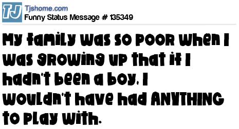 - # 179967 When I was a kid, my family was so poor that if I hadn't been a boy I wouldn't have had ANYTHING to play with.