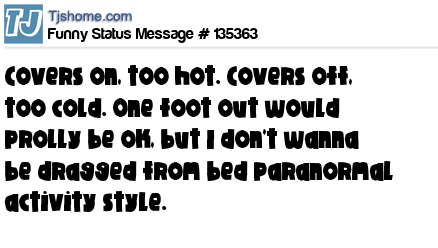 - # 153449 Covers on, too hot. Covers off, too cold. One foot out would probably be ok, but I don't wanna be dragged from bed 'paranormal-activity' style..