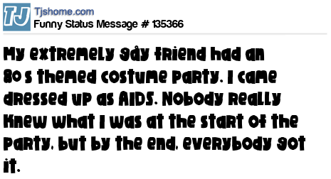 X says My extremely gåy friend had an 80′s themed costume party. I came dressed up as AIDS. Nobody really knew what I was at the start of the party, but by the end, everybody got it.