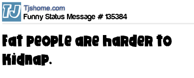 - # 117696 Saw A bumper sticker that said "Fat People Are Harder To Kidnap" not sure if he was a proud fat man or a disgruntled kidnapper though.