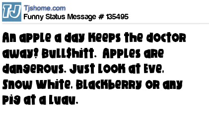 - # 187662 An apple a day is bull crap.... Apples are dangerous. Just look at Eve, Snow White, Blackberry or any pig at a luau.