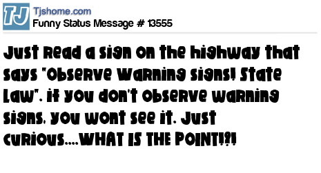 X just read a sign on the highway that says "Observe Warning signs! State Law". if you don't observe warning signs, you wont see it. Just curious....WHAT IS THE POINT!?!