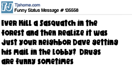 X says Ever kill a Sasquatch in the forest and then realize it was just your neighbor Dave getting his mail in the lobby? Drugs are funny sometimes