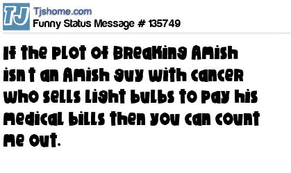 X If the plot of Breaking Amish isn’t an Amish guy with cancer who sells light bulbs to pay his medical bills then you can count me out.