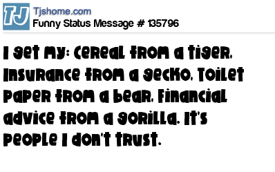 X says I get my: Cereal from a tiger, Insurance from a gecko, Toilet paper from a bear, Financial advice from a gorilla. It's people I don't trust.
