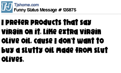 X says I prefer products that say virgin on it, like extra virgin olive oil, cause I don't want to buy a slutty oil made from slut olives.