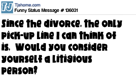 X says Since the divorce, the only pick-up line I can think of is, “Would you consider yourself a litigious person?”