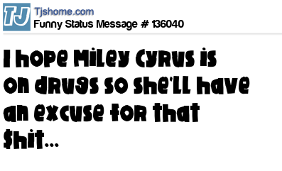 X I hope Miley Cyrus is on drugs so she'll have an excuse for that $hit...