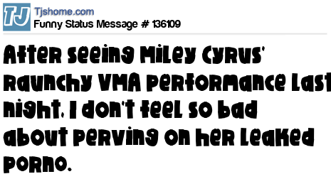 - # 136070 Just watched Miley Cyrus' VMA performance on YouTube... I'm on my way now to the health department to get tested for herpes.