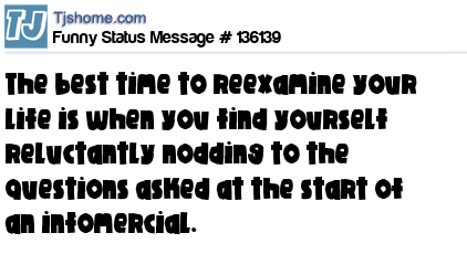 X says The best time to reexamine your life is when you find yourself reluctantly nodding to the questions asked at the start of an infomercial.