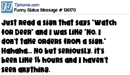 X Just read a sign that says "Watch for Deer" and I was like "No, I don't take orders from a sign." Hahaha... No but seriously, it's been like 16 hours and I haven't seen anything.