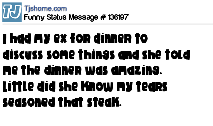 X says I had my ex for dinner to discuss some things and she told me the dinner was amazing. Little did she know my tears seasoned that steak.