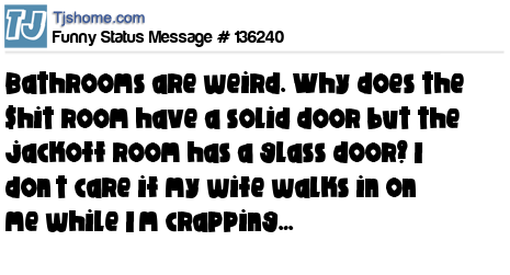 X Bathrooms are weird. Why does the $hit room have a solid door but the jackoff room has a glass door? I don’t care if my wife walks in on me while I’m crapping…