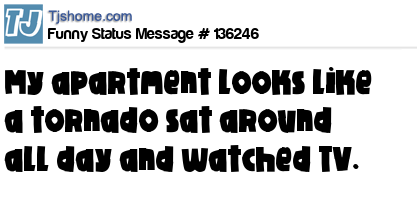 X says My apartment looks like a tornado sat around all day and watched TV.