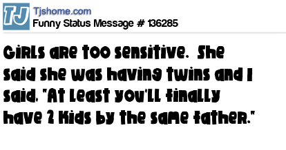 - # 160769 Women are too sensitive. She said she was having twins and I said, "At least you'll finally have 2 kids by the same father."