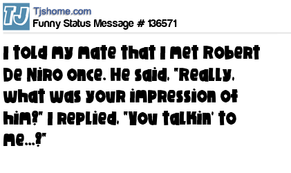 X I told my mate that I met Robert De Niro once. He said, "Really, what was your impression of him?" I replied, "You talkin' to me...?"