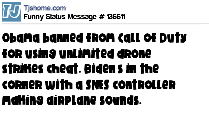 X Obama banned from Call of Duty for using unlimited drone strikes cheat. Biden’s in the corner with a SNES controller making airplane sounds.