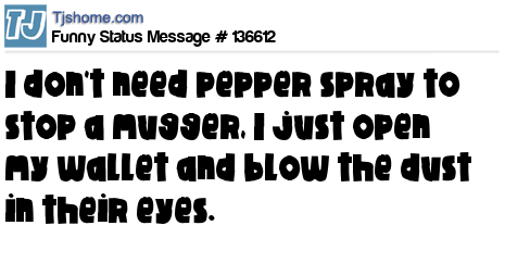 X I don't need pepper spray to stop a mugger, I just open my wallet and blow the dust in their eyes.