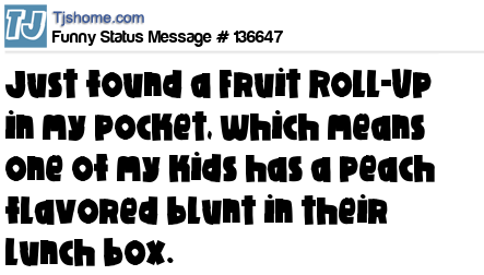 - # 81504 Found a fruit roll-up in my pocket this morning. Which means one of my kids has a peach flavored blunt wrap in their lunchbox..