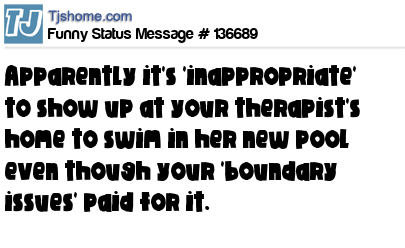 - # 188889 Apparently it's inappropriate to show up at your therapist's home to swim in his new pool even though your "boundary issues" paid for it.