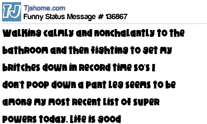 X Walking calmly and nonchalantly to the bathroom and then fighting to get my britches down in record time so's I don't poop down a pant leg seems to be among my most recent list of super powers today. Life is good ツ