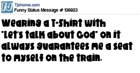 X says Wearing a T-Shirt with "Let's talk about God" on it always guarantees me a seat to myself on the train.