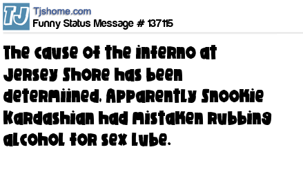X says The cause of the inferno at Jersey Shore has been determiined, Apparently Snookie Kardashian had mistaken rubbing alcohol for sex lube.